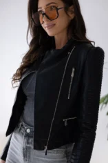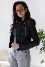 Nietuzinkowa ramoneska z pikowanymi r臋kawami oraz st贸jk膮 wykonana z wysokiej jako艣ci sk贸ry ekologicznej to model kt贸ry dope艂ni Twoje codzienne jak i bardziej wyj艣ciowe looki.